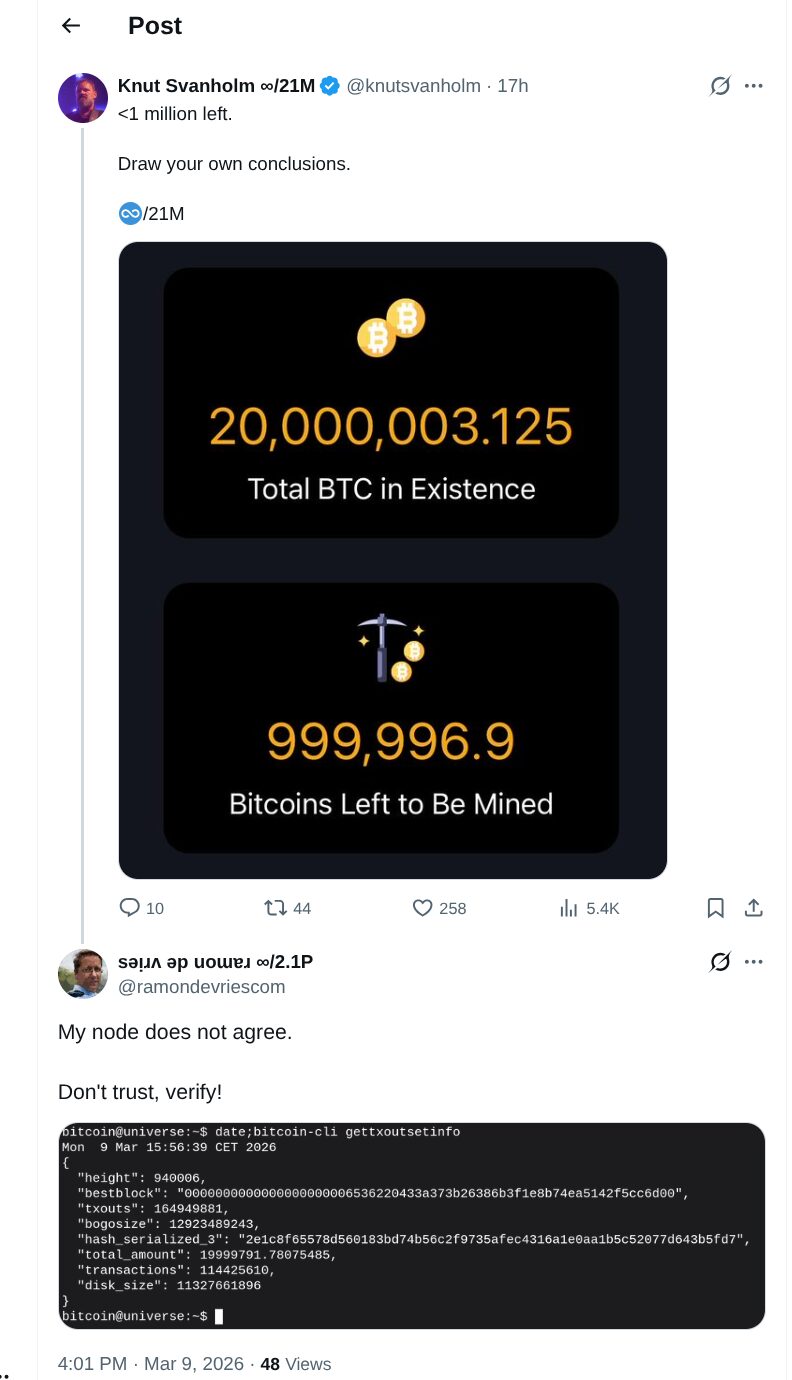 Door verschillende redenen zijn er in het verleden minder bitcoin in omloop gekomen en dus kan je niet meer berekenen wanneer een bepaalde hoeveelheid bitcoin in omloop is gebracht. Je zal op je eigen bitcoin node moeten verifiëren hoeveel bitcoin er zijn. Dit is niet moeilijk en kost maar een paar minuutjes tijd.