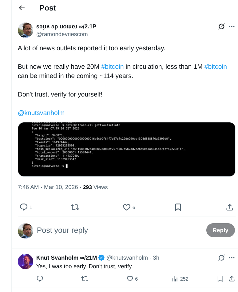 Deze ochtend is weer een mijlpaal in bitcoin gehaald: de 20 miljoenste bitcoin is in omloop gebracht. Ik heb daar ook weer eens een tweet op X aan besteed.